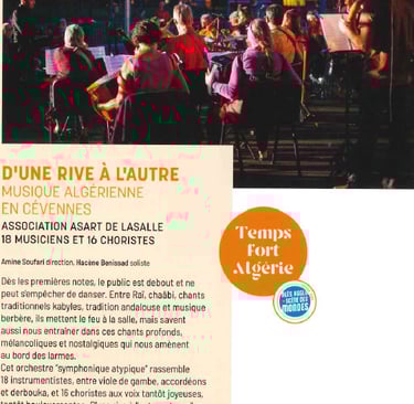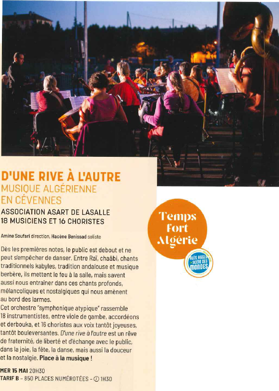 Il revint à Joachim Portalès, le président de D’une rive à l’autre, de remercier les artistes et le public ainsi que celles et ceux qui ont contribué à la réussite de cette belle soirée, notamment la municipalité de Lasalle. J’ai été confus d'être également remercié publiquement, le peu que j’ai fait ayant été si largement compensé par le bonheur rare éprouvé ce soir. Un immense mérite en revient à Amine Soufari, originaire de Laghouat, aux portes du désert, aujourd’hui pianiste, compositeur et chef de chœur dont les prestations sont saluées par l’ensemble de la critique, ainsi qu’à Françoise Malaizé, animatrice de la résidence d’artiste Le Pont des Arts à Lasalle, initiatrice de ce projet et qui en est l’âme