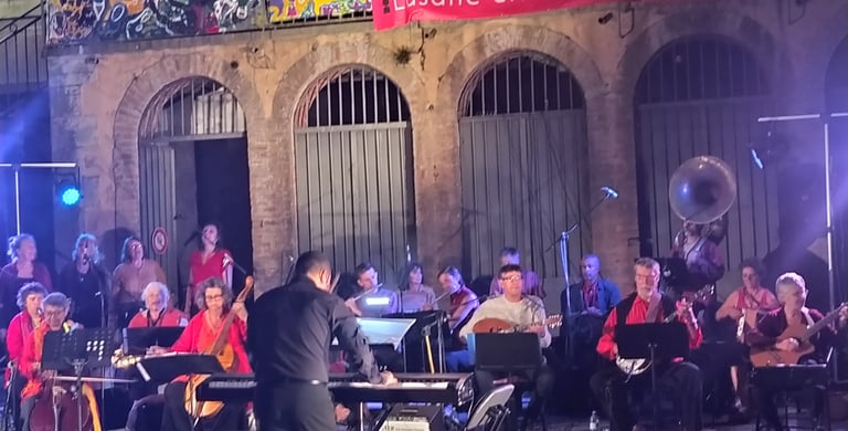Ce fut un moment de grâce, comme il s’en produit parfois, de communion du public avec les artistes. Une foule métissée de plusieurs centaines de personnes (respectant pour la plupart les gestes barrières) avait envahi la place Jean Gazaix devant la mairie et nous nous laissions emporter sur l’autre rive par la musique algérienne d’origine arabo-andalouse. Le chœur féminin qui avait dû apprendre les textes en arabe et les musicien/nes de l’orchestre déroulaient les volutes des mélodies chaâbi, élégies d’amour de Dahman El Harachi et de Cheikh El Yamine, échappées des rues chargées de mystère de la casbah d’Alger, portées par la voix d’Hacene Benissad aux accents retrouvés de Mohamed Al Anka et par des textes en français de Marion Deneux prononcés par la talentueuse Claire Léonard. Ces jeunes françaises m’ont ému, qui grâce à leur travail ont réussi à atteindre les sommets sublimes du lyrisme algérien. Aux rythmes langoureux succédèrent les plus endiablés qui entraînèrent dans la danse une jeunesse avide de s’exprimer après les contraintes du confinement sanitaire et la soirée se prolongea fort tard dans la nuit.